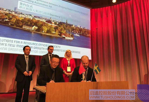 ▲ 啟迪金服總經(jīng)理、浙江機(jī)器人產(chǎn)業(yè)集團(tuán)總經(jīng)理朱春榮與瑞典浣貝爾公司代表簽約