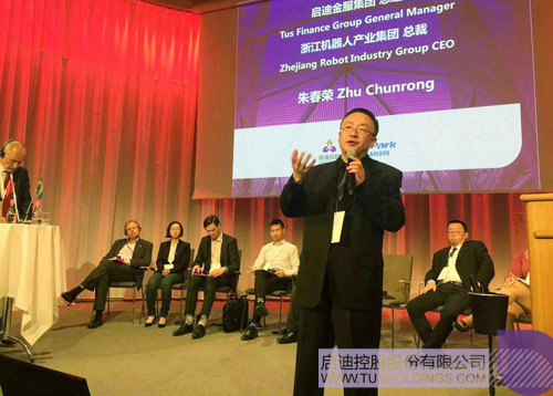 ▲ 啟迪金服總經(jīng)理、浙江機(jī)器人產(chǎn)業(yè)集團(tuán)總經(jīng)理朱春榮在瑞典諾貝爾頒獎(jiǎng)大廳演講