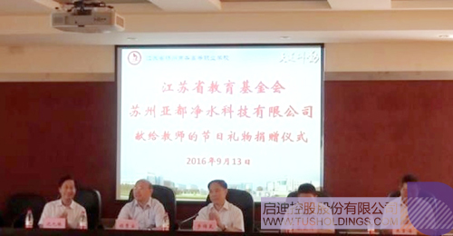 2016年9月13日,蘇州亞都凈水通過江蘇省教育基金會向兩所院校定向捐贈了51臺價值150多萬元的“亞都”校園專用直飲水設備,為校園教職員工提供安全健康的飲水保障。