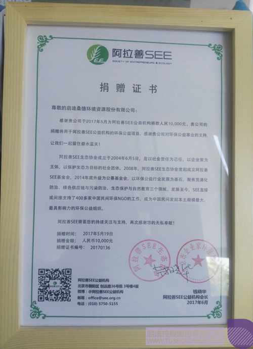 啟迪桑德于2015年9月加入SEE(阿拉善),正式成為阿拉善生態協會一員,借此平臺全面參與環境保護工作,完善企業社會責任體系建設。旗下桑頓新能源秉承“為環境,無止境”的理念,踐行綠色環保,于2016年9月5日認養青錢柳古樹,成為該認養計劃的首批愛心企業。