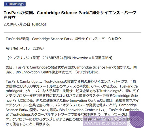 近日,由啟迪控股在英國劍橋投資建設的劍橋啟迪科技園(TusPark?Cambridge)舉辦開幕儀式和園區生命科技創新中心(Bio-InnovationCentre)封頂儀式,該活動在全球范圍內引起廣泛關注,位于美國、法國、意大利、德國、英國、加拿大、瑞士、葡萄牙、俄羅斯、日本、新加坡、韓國、澳大利亞、印度、泰國、印度尼西亞、馬來西亞等國家和中國香港、澳門、臺灣地區的共計數百家媒體對此進行了不同形式的報道。