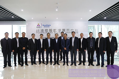 王濟(jì)武董事長(前排左二)向唐良智書記(前排左一)介紹啟迪控股業(yè)務(wù)布局
